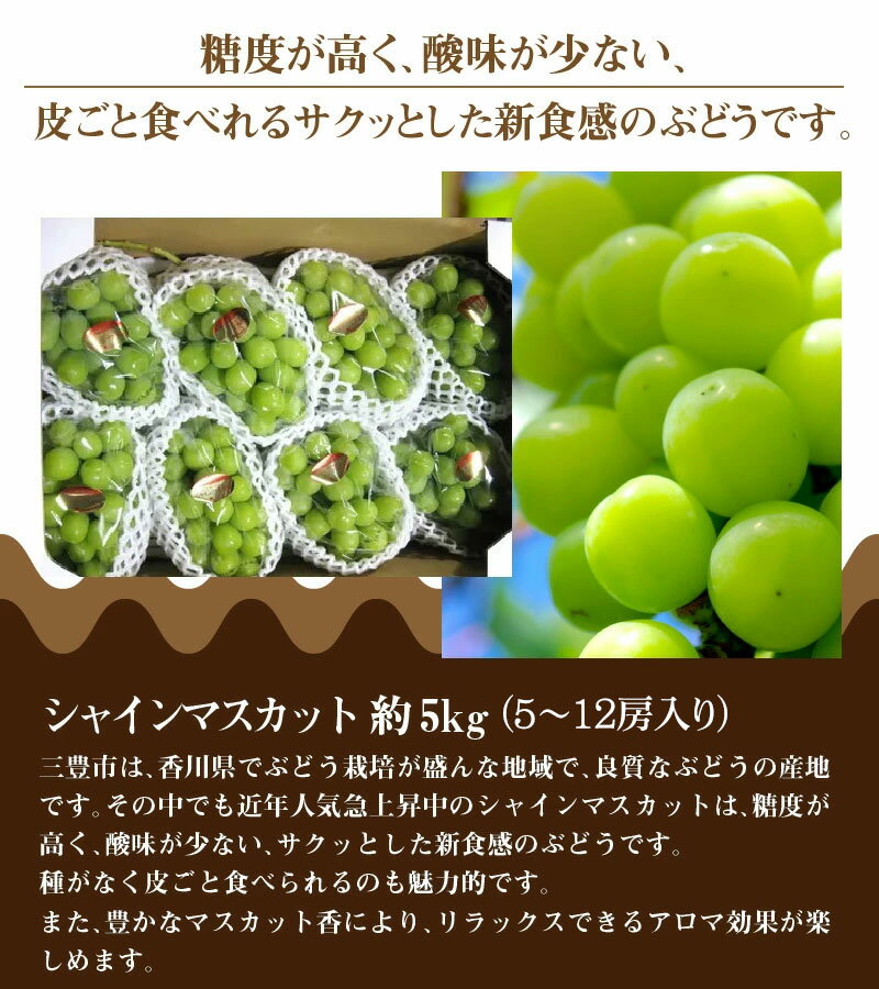 【ふるさと納税】先行予約 シャインマスカット 約5kg 5~10房 送料無料 産地直送 旬の果物 フルーツ お取り寄せグルメ お取り寄せ ギフト プレゼント 贈り物 皮ごと食べられる 種なし ぶどう 種なしぶどう 冷蔵便 三豊市 香川県