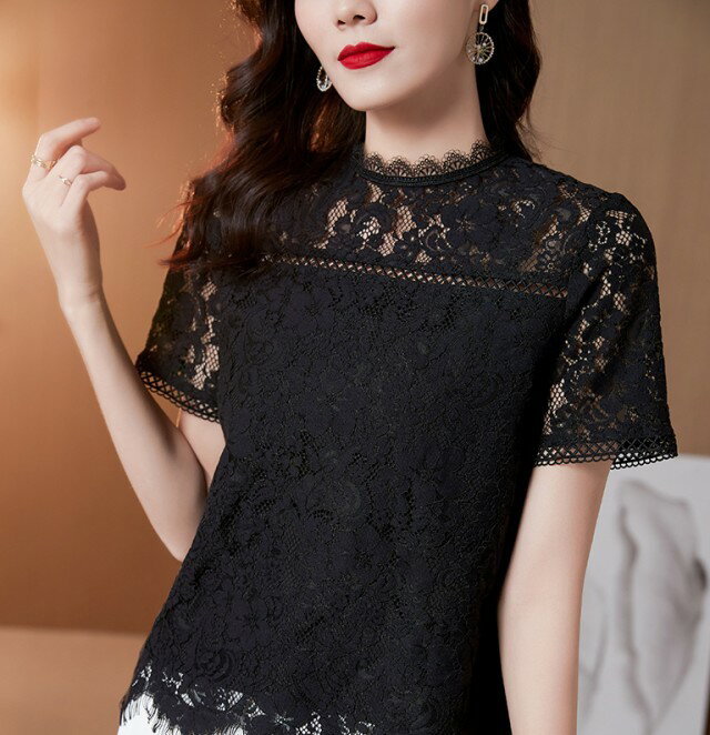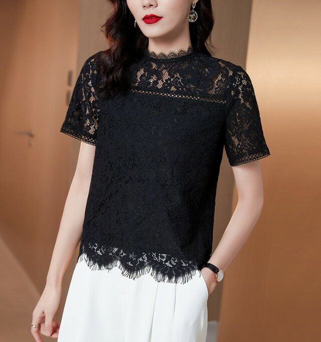 レース トップス レディース 夏 春 半袖 ブラウス カットソー スタンドカラー 大きいサイズ 3L 黒 白 シンプル きれいめ カジュアル 通勤服 オフィス スーツ インナー おしゃれ 上品 20代 30代 40代 50代