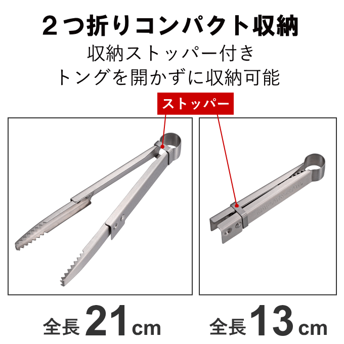 たためる ソロトングの解説 ソロキャンプに最適な2つ折りのコンパクト収納トング。