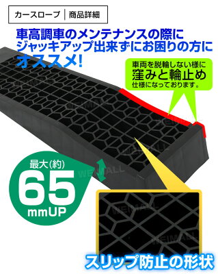 車高調車のメンテナンスの際に、ジャッキアップできずにお困りの方におススメ! 商品仕様 耐荷重:2.0t(2個使用) 本体外寸(約):W700xD200xH80mm スロープ面(約): ・タイヤ幅200mm ・高さ64mm ・長さ500mm ・立ち上がり10mm ・角度8.5° 重量(約):1.5kg(1個) 材質:ポリプロピレン 色:ブラック 注意事項 ・安全に作業するため、スロープで乗り上げた後はカーストッパー等を使用して確実に車両を固定して下さい。