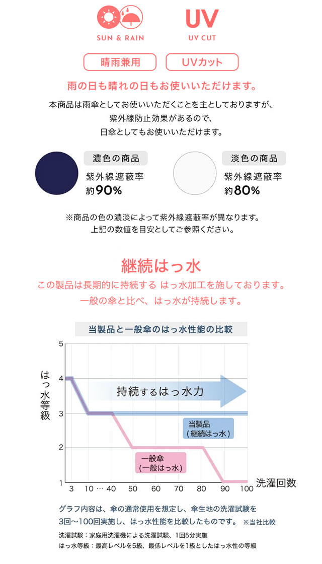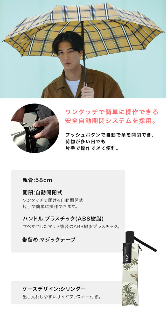 ●【素材】 ・[生地]ポリエステル100% ・[手元]プラスチック(ABS樹脂) ●【仕様】 ・[開閉]自動開閉 ・晴雨兼用 ・継続撥水加工 ・UVカット率80~90% ・安全自動開閉システム(ASC)採用 ・収納ケース付き ※UVカット率は淡色80%、濃色90%となっています。